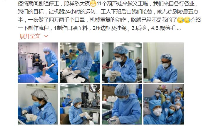 微博上,高鑫寫道:“疫情期間劇組停工,照樣熬大夜。11個(gè)葫蘆娃來做義工啦,我們的目標(biāo),讓機(jī)器24小時(shí)運(yùn)轉(zhuǎn)。工人下班后由我們接替,晚九點(diǎn)到凌晨五點(diǎn)半,一夜做了42000個(gè)口罩,機(jī)械重復(fù)的動(dòng)作,胳膊已經(jīng)不是我的了。”微博上他還介紹了做口罩的流程,圖文并茂,十分“走心”。