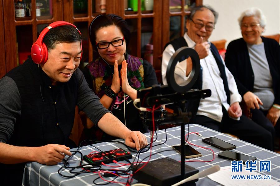 武凌云(左一)在直播中表演晉劇片段(3月6日攝)。 新華社記者 曹陽 攝