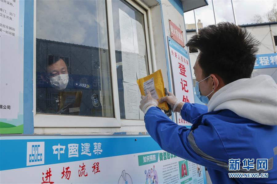 3月12日,李杰(右)在一個(gè)投遞點(diǎn)向傳達(dá)室工作人員詢問(wèn)收件人的信息。新華社記者張玉薇攝