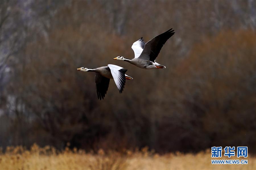 3月14日,斑頭雁在拉魯濕地上空飛翔。新華社記者詹彥攝