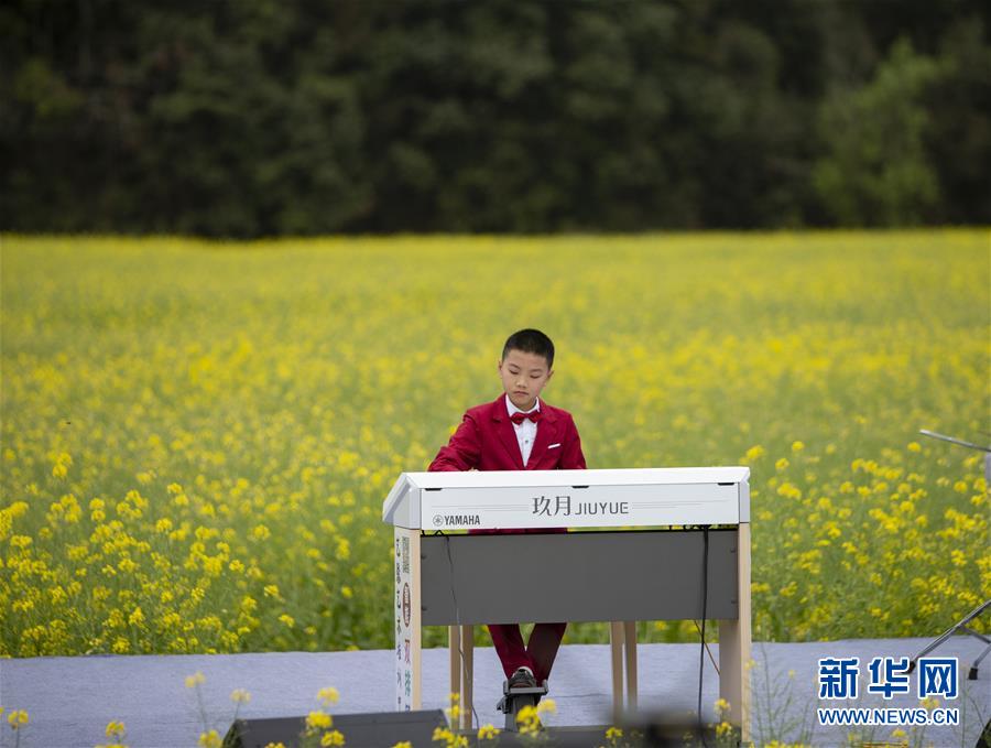 3月16日,一名小演員在李坑村的“花田音樂會”上演奏。 當(dāng)日,一場別開生面的“花田音樂會”在江西省婺源縣秋口鎮(zhèn)李坑村的油菜花海中舉行,帶給游人新鮮的視聽感受。 新華社記者 張浩波 攝