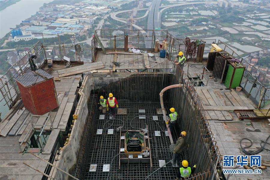 3月18日,施工人員在廣州南沙港鐵路跨西江斜拉橋東主塔進(jìn)行封頂施工(無(wú)人機(jī)照片)。新華社記者劉大偉攝