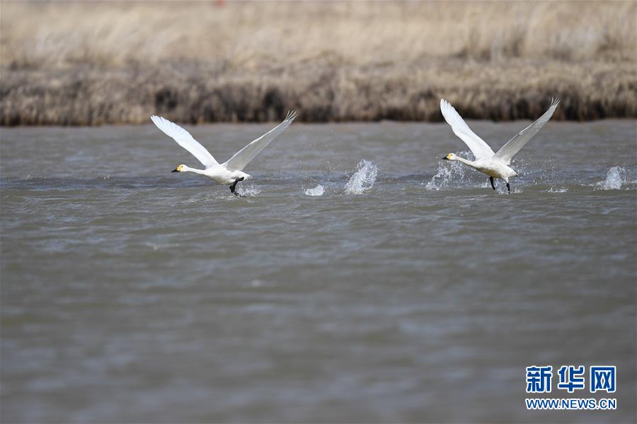 3月18日,候鳥在準格爾旗大路鎮(zhèn)的黃河淺灘上起飛。 新華社記者 于嘉 攝