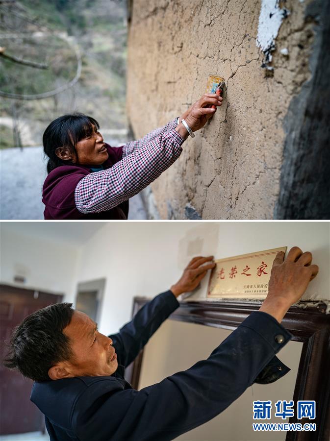 這是一張拼版照片:上圖為云南省永善縣大興鎮(zhèn)駱丘村村民王大香拆下老屋的門牌留作紀(jì)念(3月14日攝);下圖是作為現(xiàn)役軍人家屬的晏付高把“光榮之家”的牌匾掛在新家的門上(3月15日攝)。 新華社記者 江文耀 攝