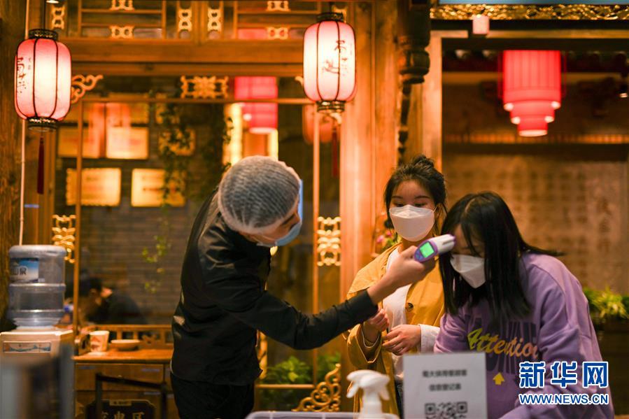 3月21日,在四川省成都市的一家火鍋店門口,顧客在登記信息,接受體溫檢測(cè)。近日,在做好新冠肺炎疫情防控措施的基礎(chǔ)上,四川省成都市的火鍋店逐漸恢復(fù)營業(yè)。新華社記者唐文豪攝