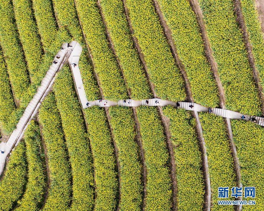 3月25日,游客游覽新登鎮(zhèn)上旺村黑山頂近百畝的油菜花海(無人機照片)。新華社記者徐昱攝