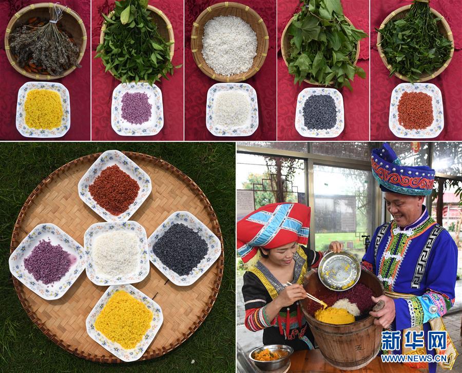 上五圖:4種不同植物及其色素染成的糯米和原色糯米;下左圖:4種不同植物色素染成的糯米和原色糯米;下右圖:在廣西上林縣巷賢鎮(zhèn),兩名壯族村民在查看一桶剛剛蒸熟的五色糯米飯(拼版圖片,3月25日攝)。每年“壯族三月三”到來之際,廣西的壯族同胞都有蒸制五色糯米飯迎接節(jié)日的習(xí)俗,以祈禱五谷豐登,五福臨門。這些五色糯米飯,主要采用天然植物萃取色素,將糯米分別浸泡到紫、黃、紅、黑4種不同植物色素的水里,充分染色后,與原色糯米一起蒸熟而成。色澤鮮艷、清香誘人的五色糯米飯,是“壯族三月三”接待來客時(shí)必不可少的傳統(tǒng)美食。新華社記者陸波岸攝