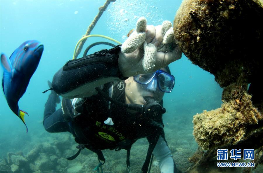 3月28日,在位于海南三亞蜈支洲島旅游區(qū)的海洋牧場(chǎng),工作人員在清理附著在珊瑚上的漁網(wǎng)。近日,位于海南三亞蜈支洲島旅游區(qū)的海洋牧場(chǎng)復(fù)工,海底作業(yè)逐漸恢復(fù)正常,開(kāi)始進(jìn)行人工魚(yú)礁吊裝擺位、水下監(jiān)控清理以及日常巡護(hù)等工作。據(jù)介紹,人工魚(yú)礁有利于魚(yú)類種類增加和數(shù)量提高,蜈支洲島海域海洋牧場(chǎng)人工魚(yú)礁表面附著珊瑚、貝類、藻類等生物種類達(dá)120余種。新華社記者楊冠宇攝