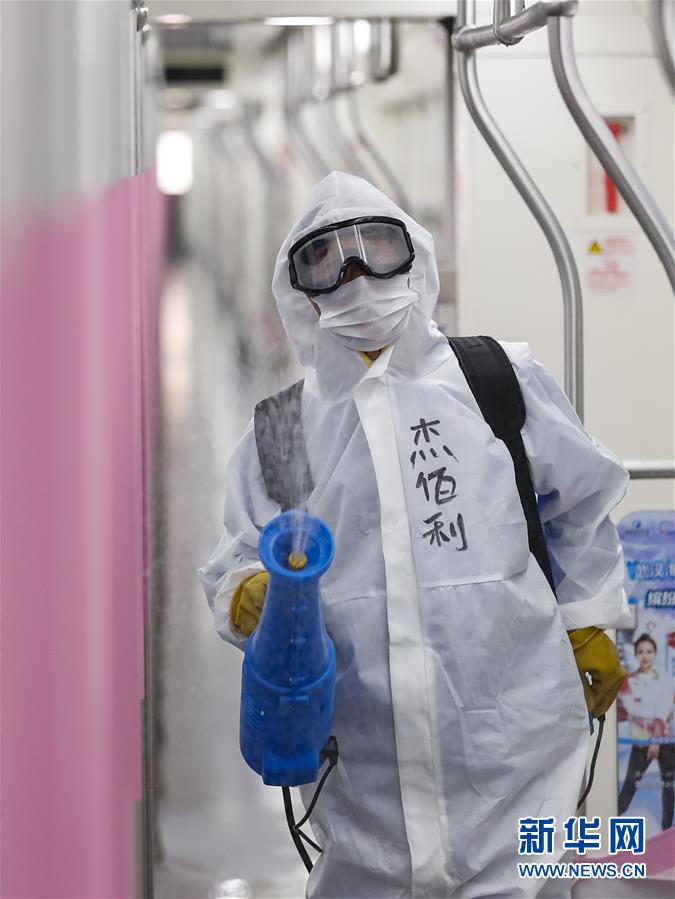 3月23日,在武漢地鐵常青車輛段,保潔人員在消毒。新華社記者肖藝九攝