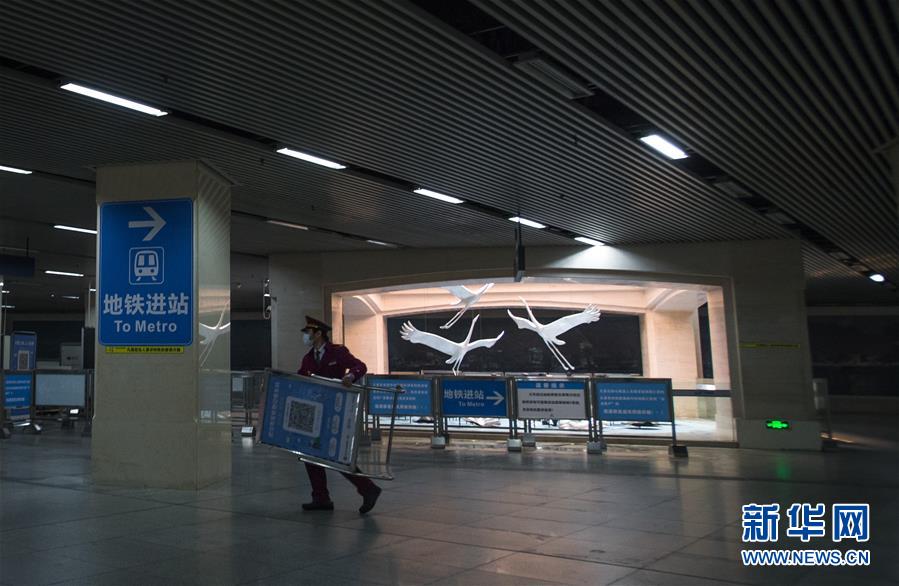 3月23日,在漢口火車站地鐵站,工作人員將進(jìn)站的二維碼牌搬運(yùn)至進(jìn)站口。新華社記者肖藝九攝
