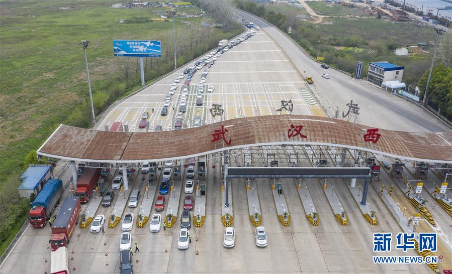 3月24日,在武漢西高速收費(fèi)站交通卡點(diǎn),返漢車輛排隊(duì)等候入城(無(wú)人機(jī)照片)。新華社記者才揚(yáng)攝