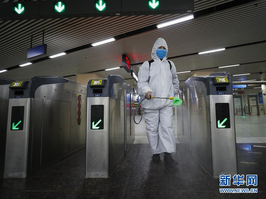 3月23日,在漢口火車站地鐵站,保潔人員在為站臺(tái)消毒。新華社記者沈伯韓攝