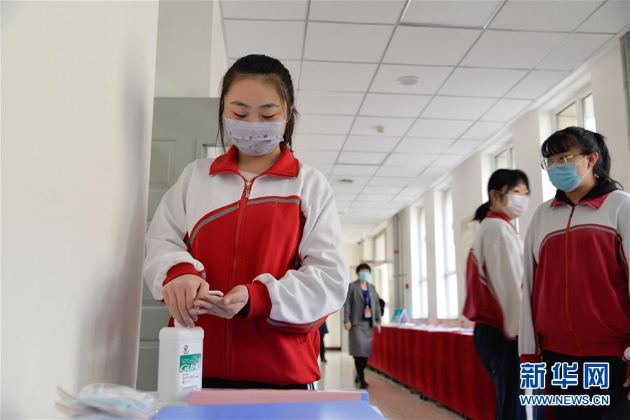 3月30日,學(xué)生在呼和浩特市第六中學(xué)教室外的走廊上使用免洗洗手液。當(dāng)日,內(nèi)蒙古自治區(qū)全區(qū)高三和初三年級(jí)開學(xué)復(fù)課。新華社記者徐欽攝