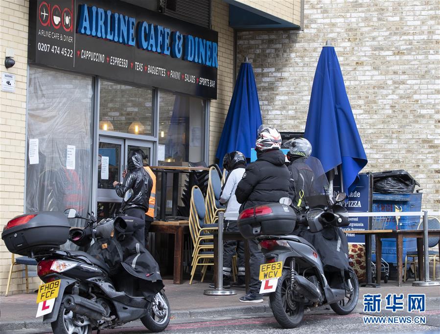 3月30日,在英國(guó)倫敦,幾名外賣送餐騎手在一家餐廳外等待取餐。英國(guó)衛(wèi)生部30日發(fā)布的數(shù)據(jù)顯示,英國(guó)新冠肺炎確診病例累計(jì)22141例,較前一天增加2619例;累計(jì)死亡病例增至1408例。新華社記者韓巖攝