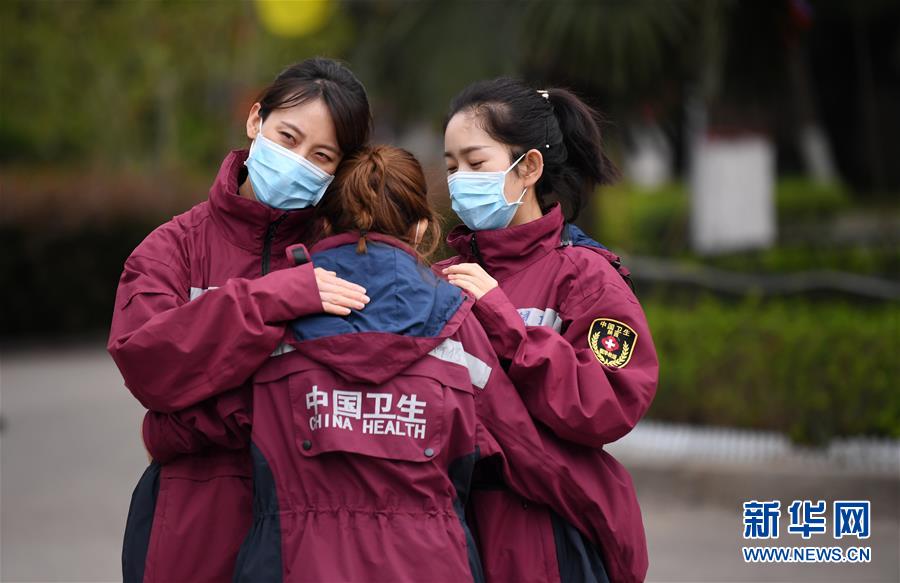 4月3日,陜西醫(yī)療隊隊員擁抱告別。 當(dāng)日,陜西省第一批援鄂醫(yī)療隊137名隊員在陜西省工人療養(yǎng)院結(jié)束了為期兩周的隔離休養(yǎng)。醫(yī)療隊員與“戰(zhàn)友”深情作別后,陸續(xù)踏上歸途。 新華社記者 李一博 攝
