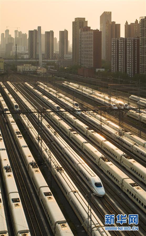 4月7日,在武漢動車段,列車??吭诖孳嚲€上(無人機(jī)照片)。 新華社記者 肖藝九 攝