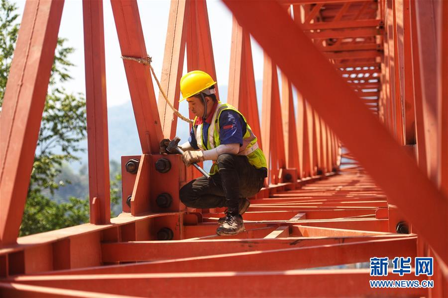 4月8日,兩名中鐵四局職工安裝架設鋼桁梁,每節(jié)鋼桁梁間的精度需要達到毫米級才能保證安裝到位。新華社記者江文耀攝