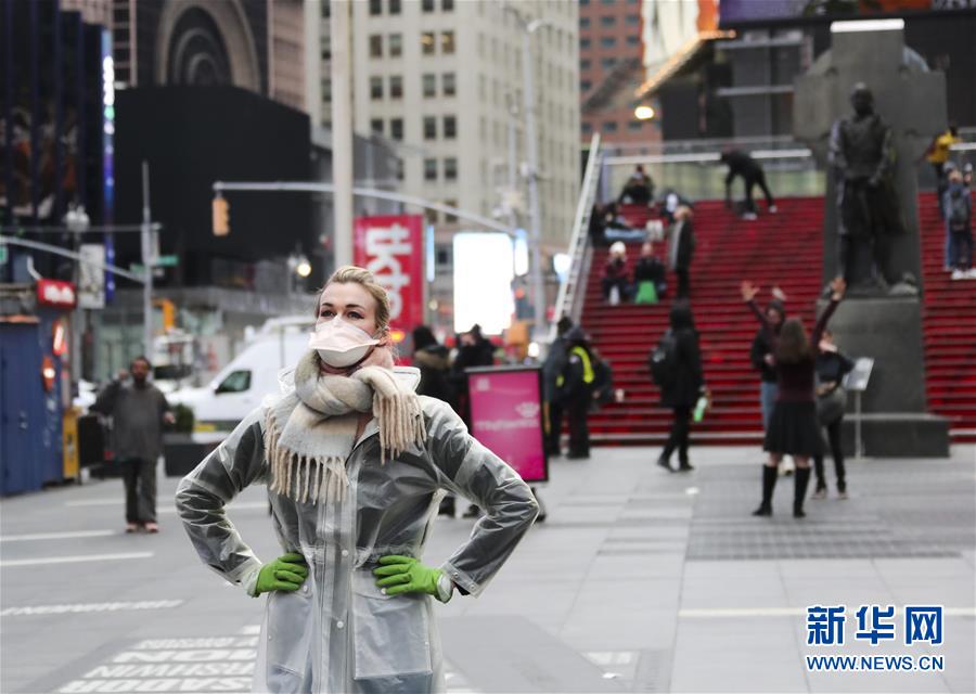 3月19日,一名戴口罩的女子在美國(guó)紐約曼哈頓時(shí)報(bào)廣場(chǎng)拍照。新華社記者王迎攝