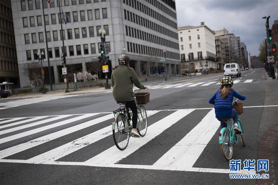 4月1日,在美國(guó)首都華盛頓,兩名市民在白宮附近的一條馬路上騎車。新華社記者劉杰攝