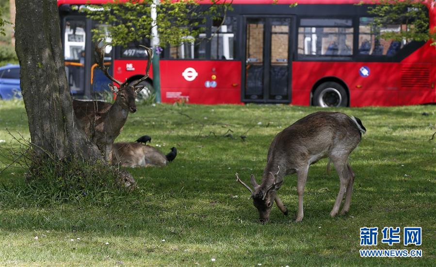 4月8日,在英國(guó)倫敦東部一個(gè)居民區(qū),附近公園里的鹿在草坪上吃草。隨著新冠疫情在英國(guó)的擴(kuò)散,政府要求人們減少不必要的外出。倫敦東部一個(gè)居民區(qū)附近公園里原來(lái)散養(yǎng)的鹿紛紛從公園走出來(lái),或吃草或接受附近居民的喂食,成為特殊時(shí)期居民區(qū)里的新“客人”。新華社記者韓巖攝