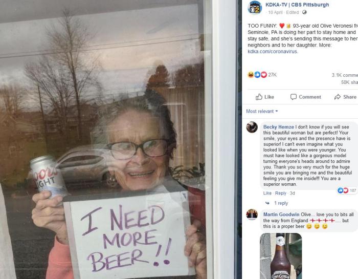 據(jù)報道,老太太表示,自州長下令居家避疫后,她盡好公民本分,未曾離開家門。但后來眼見只剩兩罐啤酒,于是想出這個辦法向鄰居及女兒求援,不料獲得廠商關(guān)注,老太太最終獲啤酒商贈送150罐啤酒,并留下有趣組圖。
