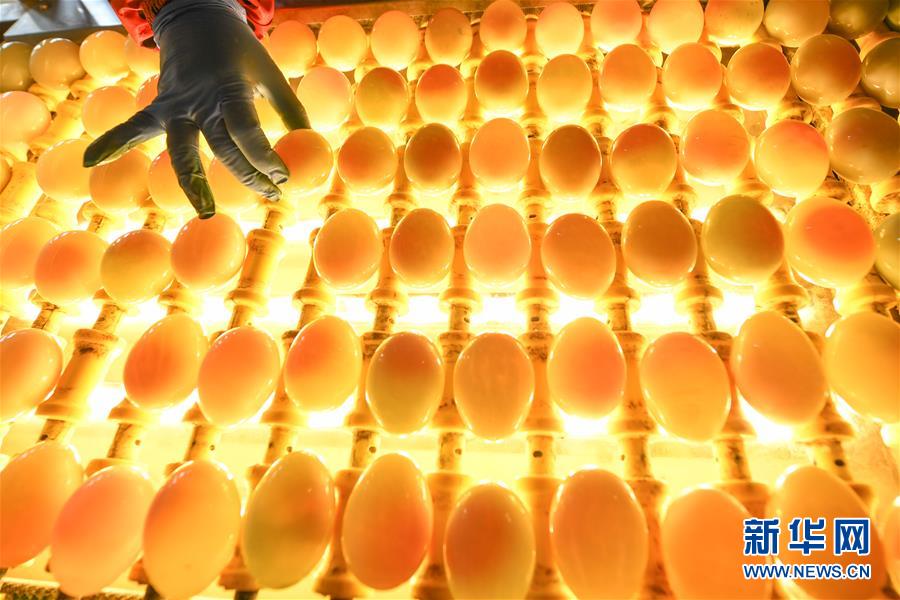 江蘇高郵鴨集團(tuán)的工作人員在生產(chǎn)線上對(duì)鴨蛋進(jìn)行光檢作業(yè)(4月15日攝)。“高郵鴨蛋”是江蘇高郵的特色農(nóng)業(yè)名片。近年來,當(dāng)?shù)卦诹挤N繁育、生態(tài)養(yǎng)殖、產(chǎn)品加工等方面加大力度,推動(dòng)高郵鴨蛋品牌化建設(shè),讓小鴨蛋成為帶動(dòng)農(nóng)戶致富的大產(chǎn)業(yè)。2019年,高郵市共計(jì)生產(chǎn)熟制鴨蛋產(chǎn)品近11.2億枚,年產(chǎn)值近17.68億元。新華社記者李博攝