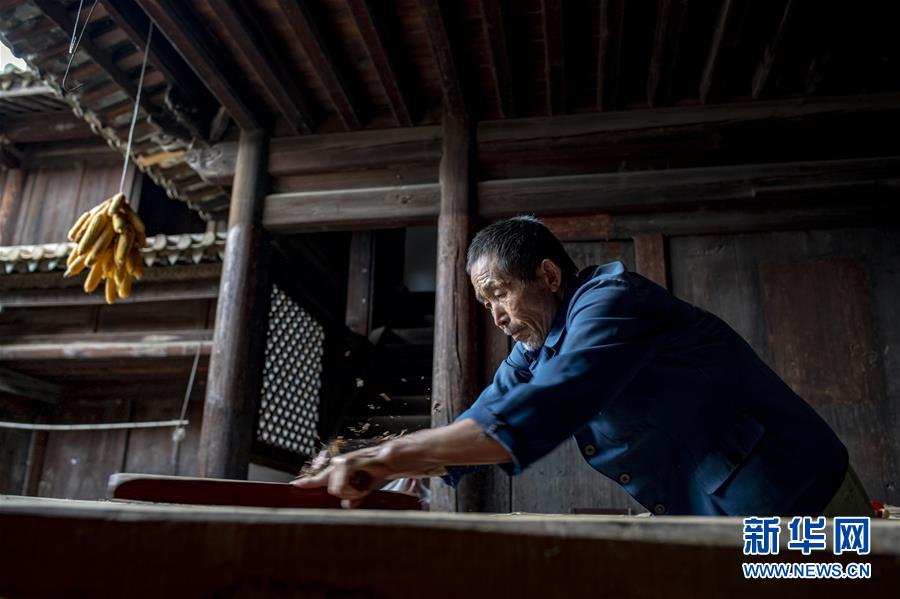 73歲的石屏縣異龍鎮(zhèn)符家營村村民楊國保在家中制作村里修整老屋所需的木梁(8月8日攝)。新華社記者江文耀攝