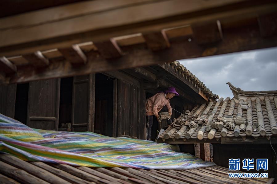 在石屏縣異龍鎮(zhèn)符家營村211號民居,工人王艷華在修繕屋頂(8月8日攝)。新華社記者江文耀攝