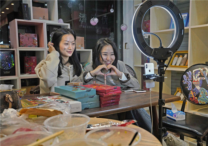 2019年11月10日,浙江金華,義烏北下朱村,倆主播在銷售化妝品,一個主播做出愛心的手型,對她們的“老鐵”(粉絲)示好。
