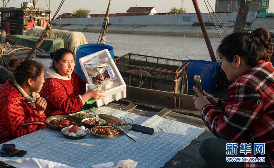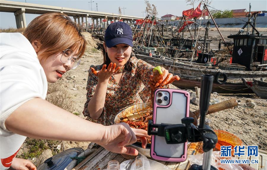 4月22日,馬花雨(下右)、徐紅紅(上)、陸倩(下左)在漁船上拍攝推銷海產(chǎn)品的短視頻。近年來,江蘇省連云港市贛榆區(qū)海頭鎮(zhèn)越來越多的居民開始直播銷售海產(chǎn)品,當(dāng)?shù)貪O船、碼頭和市場上活躍著一批網(wǎng)絡(luò)直播好手。目前,全鎮(zhèn)有3000多戶商家從事海產(chǎn)品直播銷售業(yè)務(wù),形成了集捕撈、加工、包裝、銷售和物流于一體的電商產(chǎn)業(yè)鏈。新華社記者楊磊攝
