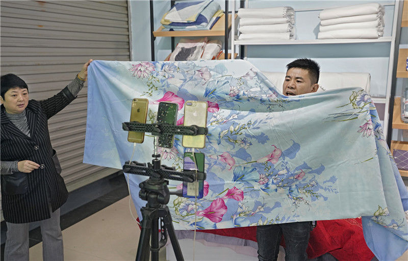 2019年11月10日,江金華,義烏北下朱村,在店鋪里直播銷售床上用品的兩個店員。