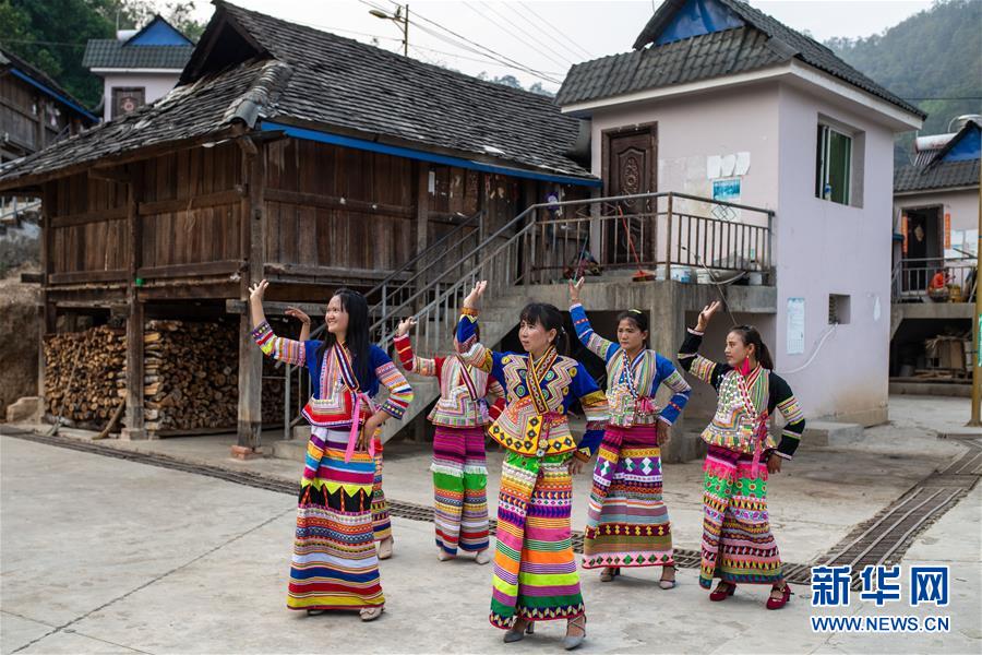 4月10日,在云南省勐??h布朗山鄉(xiāng)曼囡村曼班三隊,娜四(中)和村民一起跳舞。新華社記者胡超攝