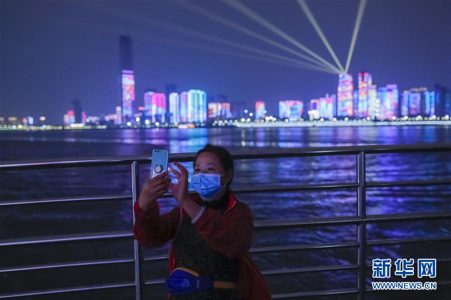 4月22日,市民乘坐武漢長江客運(yùn)輪渡出行時,在船上拍攝夜景。為建立與經(jīng)濟(jì)社會發(fā)展和疫情防控需要相適應(yīng)的運(yùn)輸服務(wù)保障機(jī)制,保障市民出行需求,從4月22日起,武漢城市公共交通有序恢復(fù)全線網(wǎng)運(yùn)營。新華社記者沈伯韓攝
