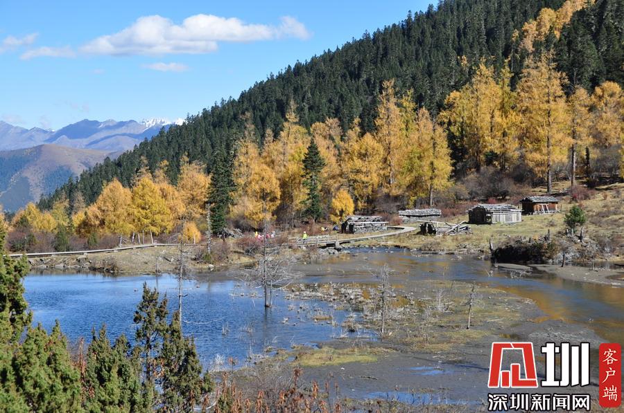 溝里有大片的落葉松、杜鵑和云杉林,雪山、海子、濕地、河流等景觀應(yīng)有盡有,唯獨(dú)沒(méi)有公路,只能沿木棧道徒步游覽。李仁奇攝