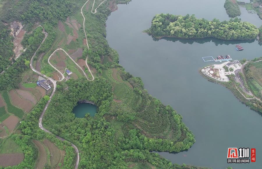 2020年4月24日,在湖南張家界市永定區(qū)“百里畫廊”茅巖河景區(qū)拍攝的“天坑心湖”。(無人機拍攝)