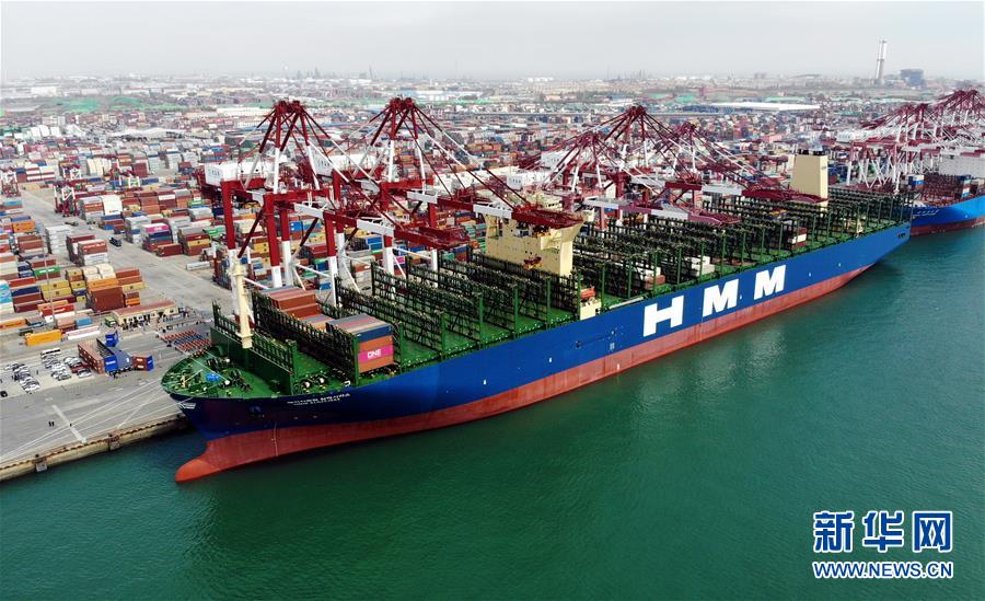 “現(xiàn)代商船阿爾赫西拉斯”輪靠泊在青島港前灣碼頭(無(wú)人機(jī)照片,4月26日攝)。當(dāng)日,載箱量可達(dá)2.4萬(wàn)標(biāo)準(zhǔn)箱的世界最大集裝箱船“現(xiàn)代商船阿爾赫西拉斯”輪從山東青島港開啟首航,這條船的甲板面積超過(guò)2.4萬(wàn)平方米,相當(dāng)于3.5個(gè)標(biāo)準(zhǔn)足球場(chǎng)大小。新華社記者李紫恒攝