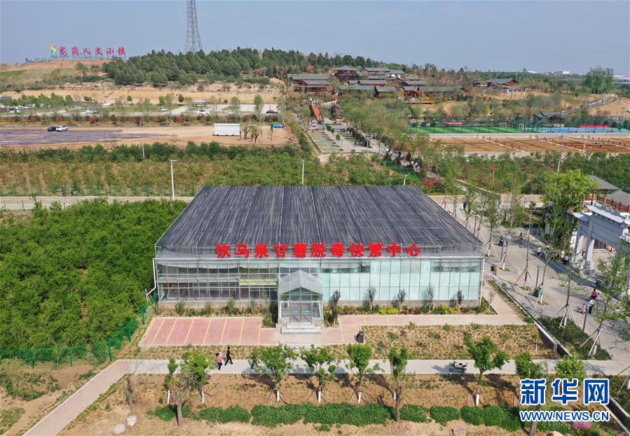 這是5月1日拍攝的河南省鶴壁市淇濱區(qū)鉅橋鎮(zhèn)崗坡村飲馬泉甘薯脫毒快繁中心(無人機(jī)照片)。  新華社記者馮大鵬攝