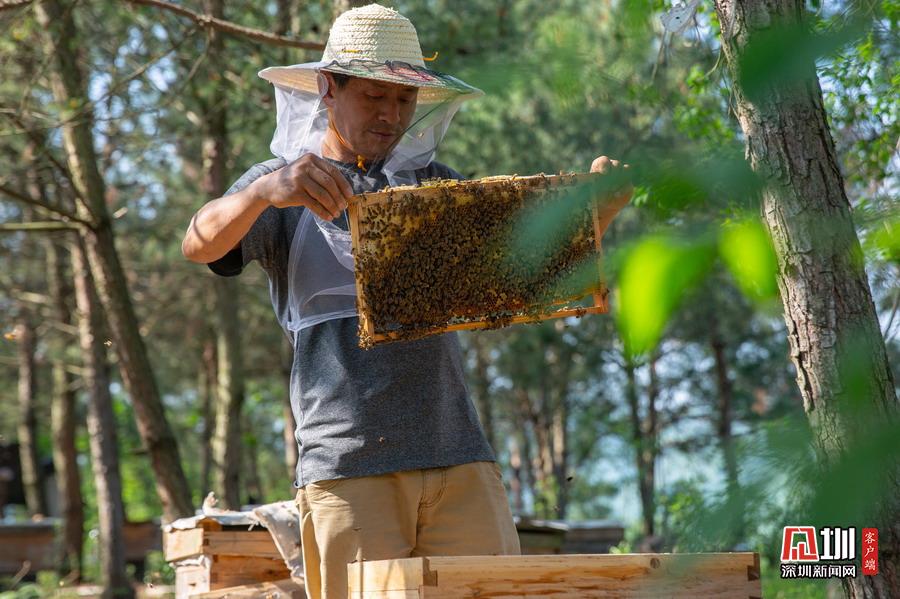 2020年5月3日,湖北省襄陽市,在南漳三道河水庫小島上,小島養(yǎng)蜂人趙德海每天要巡視蜂箱,查看蜂箱的蜜蜂密集度和蜜蜂繁殖情況,及時調整,才能避免蜜蜂受損。