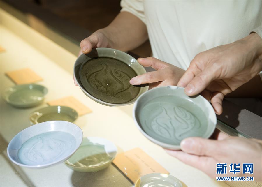 5月8日,“90后”瓷人湯佳(左)將自己制作的魚紋盤帶到龍泉青瓷裝飾紋樣研究所,跟項(xiàng)宏金收藏的古瓷器比對(duì)。1965年出生的項(xiàng)宏金,被浙江龍泉年輕一代瓷人稱為“項(xiàng)哥”,他從20世紀(jì)90年代開始收集龍泉青瓷標(biāo)本,研究青瓷紋樣。2014年出版著作《龍泉青瓷裝飾紋樣》,次年開設(shè)龍泉青瓷裝飾紋樣研究所,將自己收藏的千余件標(biāo)本跟瓷器愛好者、創(chuàng)作者免費(fèi)分享。新華社記者翁忻旸攝