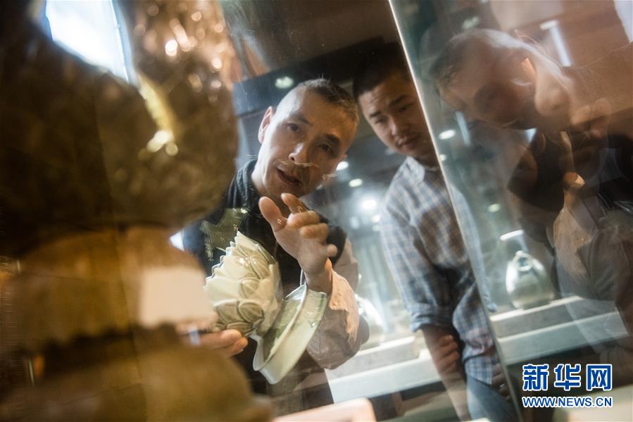 5月8日,項(xiàng)宏金(左)在龍泉青瓷裝飾紋樣研究所向來訪的年輕瓷人介紹兩件蓮瓣紋作品的細(xì)節(jié)。1965年出生的項(xiàng)宏金,被浙江龍泉年輕一代瓷人稱為“項(xiàng)哥”,他從20世紀(jì)90年代開始收集龍泉青瓷標(biāo)本,研究青瓷紋樣。2014年出版著作《龍泉青瓷裝飾紋樣》,次年開設(shè)龍泉青瓷裝飾紋樣研究所,將自己收藏的千余件標(biāo)本跟瓷器愛好者、創(chuàng)作者免費(fèi)分享。新華社記者翁忻旸攝