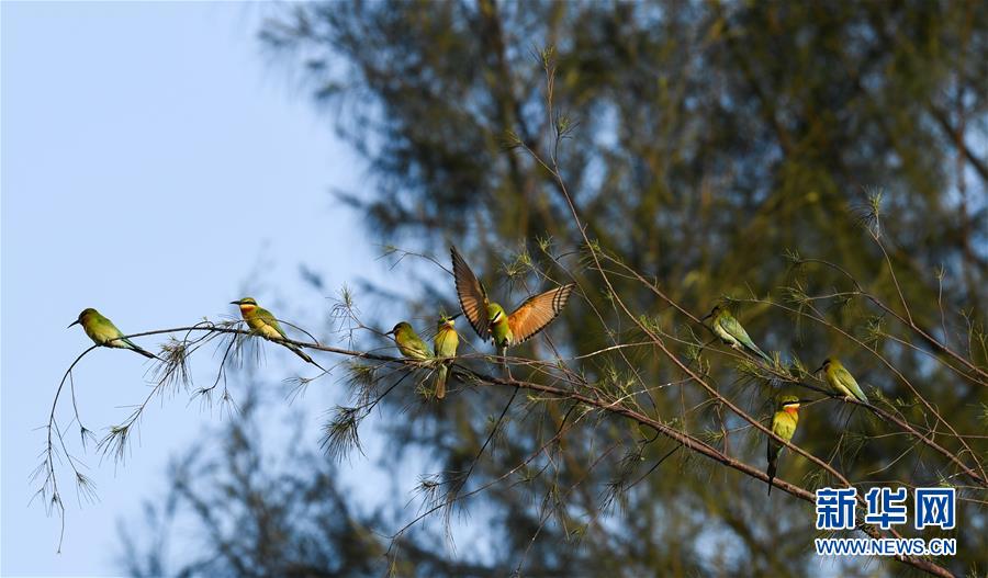 5月8日,在海口五源河下游蜂虎保護(hù)小區(qū),栗喉蜂虎和藍(lán)喉蜂虎在樹(shù)枝上休息。新華社記者楊冠宇攝