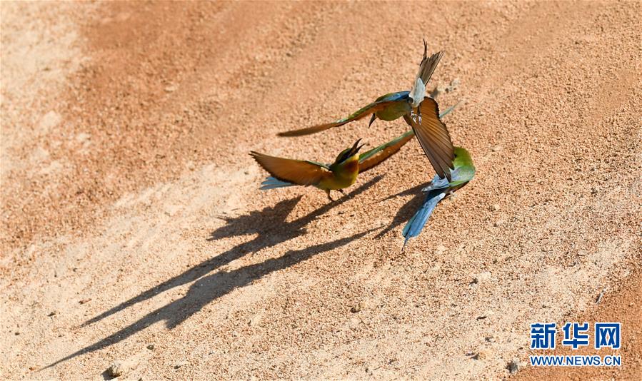 在??谖逶春酉掠畏浠⒈Wo(hù)小區(qū),栗喉蜂虎在嬉戲(5月7日攝)。新華社記者楊冠宇攝