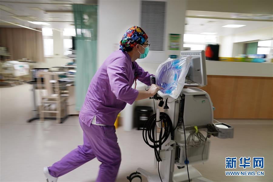 5月10日,在上海市普陀區(qū)中心醫(yī)院內(nèi)科重癥監(jiān)護(hù)室,護(hù)士來文健在推運設(shè)備。新華社記者劉穎攝