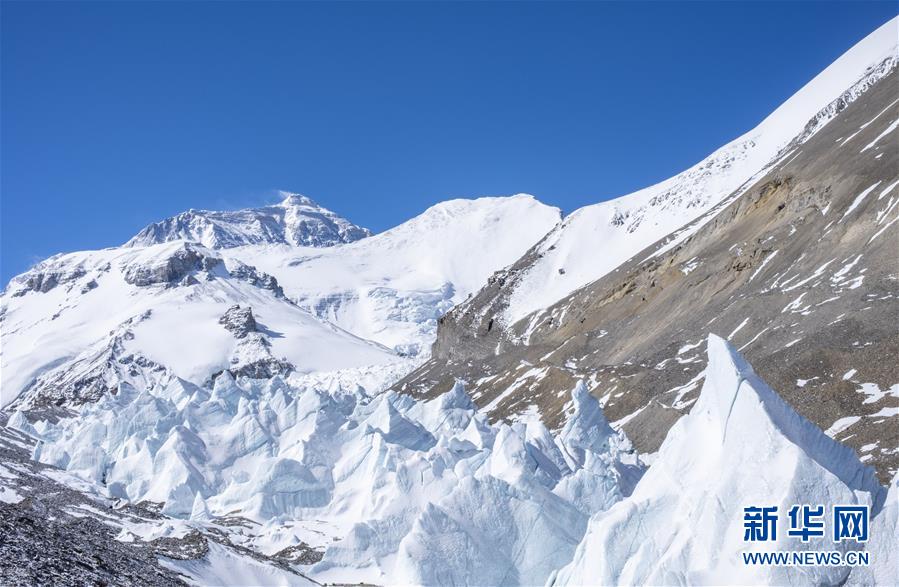 珠峰海拔5800米至海拔6500米的冰塔林(5月9日攝)。從海拔5800米的珠峰過渡營地到海拔6500米的前進(jìn)營地,冰塔林沿山谷排列,蔚為壯觀。新華社記者孫非攝