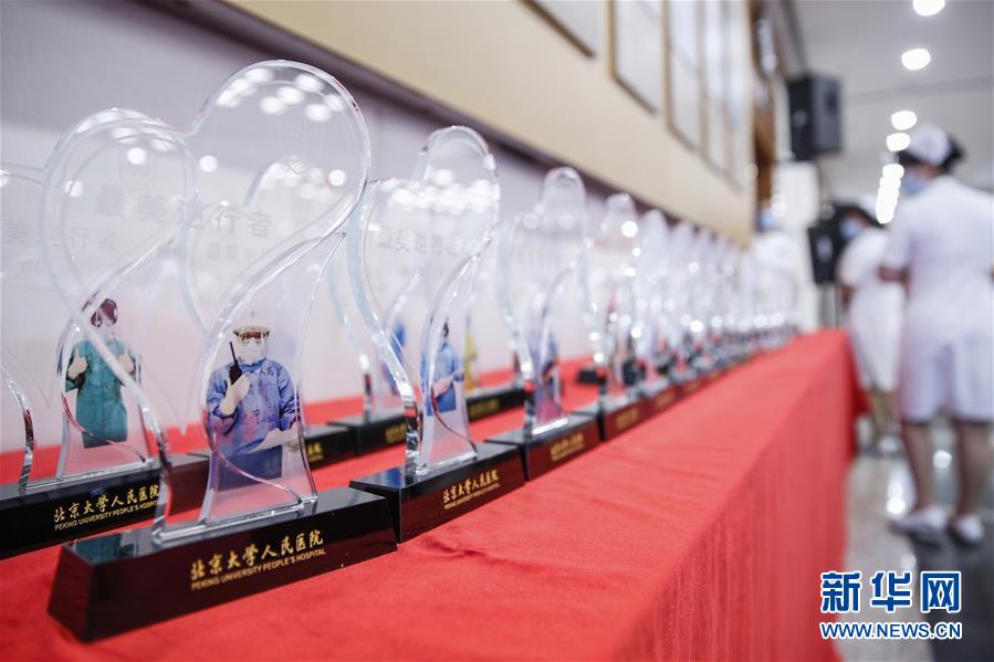5月11日,工作人員整理印有援鄂隊(duì)員工作照的獎(jiǎng)杯。在國(guó)際護(hù)士節(jié)到來(lái)之際,北京大學(xué)人民醫(yī)院11日舉辦慶祝護(hù)士節(jié)暨優(yōu)秀集體和個(gè)人表彰活動(dòng),并邀請(qǐng)?jiān)踽t(yī)療隊(duì)護(hù)士代表分享戰(zhàn)“疫”故事。我國(guó)今年護(hù)士節(jié)的主題為“致敬護(hù)士隊(duì)伍,攜手戰(zhàn)勝疫情”。新華社記者張玉薇攝