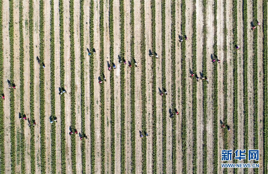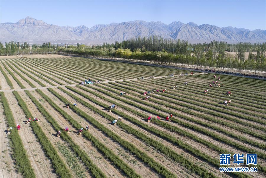 5月11日,采茶工在寧夏百瑞源賀蘭山基地采摘枸杞芽茶(無人機照片)。當日,寧夏百瑞源賀蘭山基地枸杞芽茶全面進入采摘季。據(jù)了解,該基地茶園面積300余畝,助力附近200多名農(nóng)民就業(yè)增收。新華社記者楊植森攝