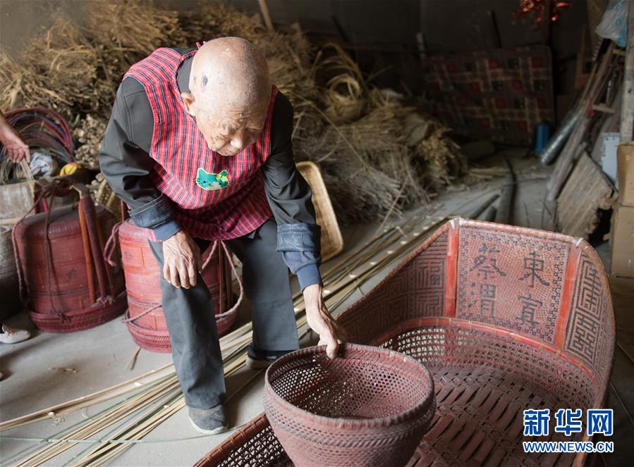 5月12日,浙江諸暨龍溪村的百歲老人蔡渭東在家中展示自己早年做的農(nóng)村婚事用的篾器。浙江諸暨東和鄉(xiāng)龍溪村有一位102歲的老人蔡渭東,他從12歲開始拜師學(xué)藝,做了90年的篾匠,如今依然耳聰目明,每天堅持編織篾器。蔡渭東老人說他舍不得丟掉這份老手藝,也希望年輕人能傳承下去。新華社記者翁忻旸攝