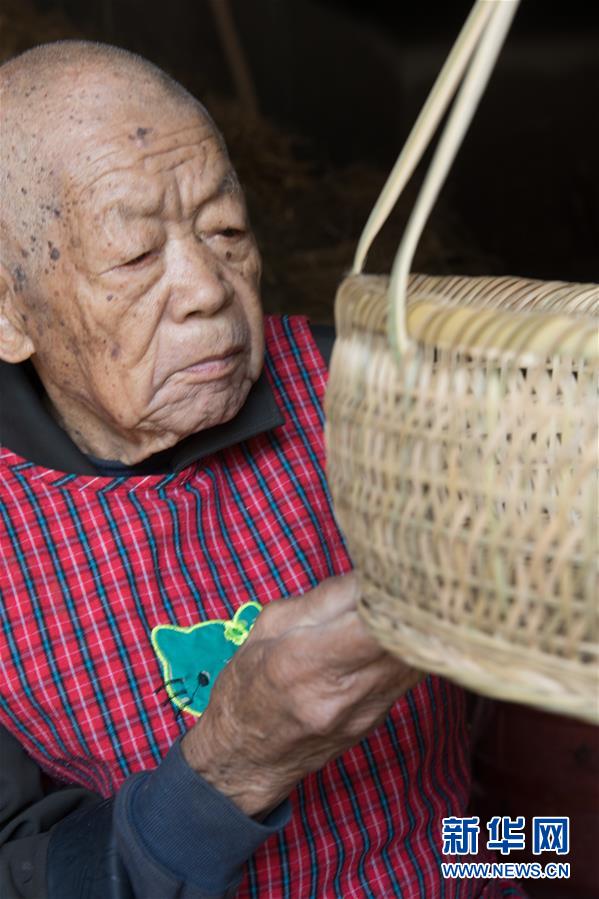 5月12日,浙江諸暨龍溪村的百歲老人蔡渭東在家中查看一個剛編的竹籃。浙江諸暨東和鄉(xiāng)龍溪村有一位102歲的老人蔡渭東,他從12歲開始拜師學(xué)藝,做了90年的篾匠,如今依然耳聰目明,每天堅持編織篾器。蔡渭東老人說他舍不得丟掉這份老手藝,也希望年輕人能傳承下去。新華社記者翁忻旸攝