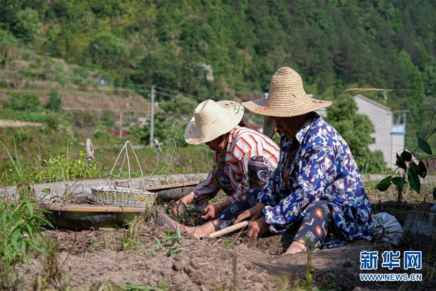 5月12日,青田縣巨浦鄉(xiāng)西坑村的村民在梯田收獲中藥貝母。當(dāng)?shù)夭扇『献魃缂懈N,冬春種中藥、夏秋種養(yǎng)水稻和田魚的方式,全面提升土地利用率和收益。新華社記者徐昱攝