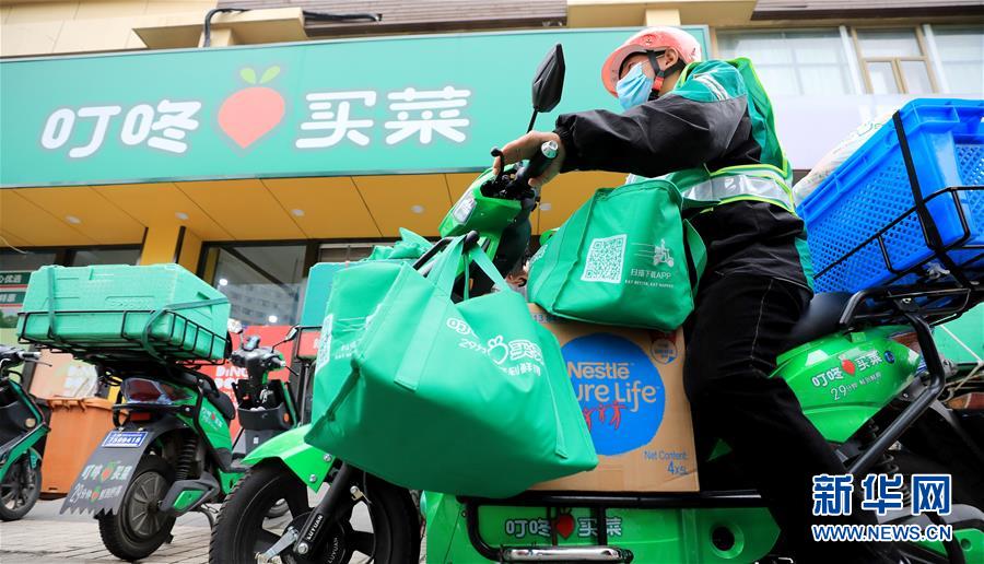 一名外送員從叮咚買(mǎi)菜上海浦東云山路前置倉(cāng)出發(fā)送貨(4月17日攝)。新華社記者方喆攝
